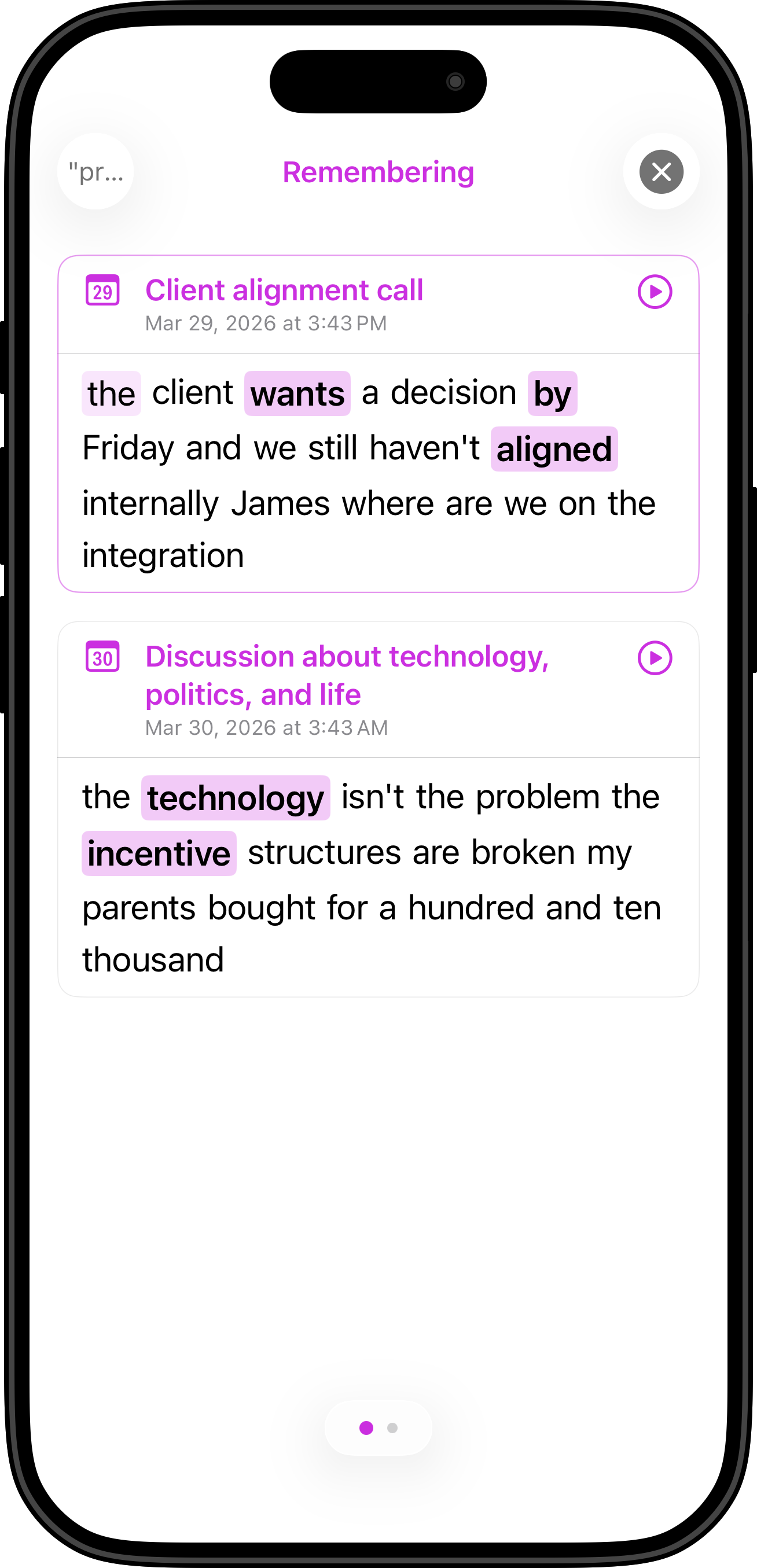 Search for terms or ask questions in the “Remember” field, and watch as a Semanticy, RRF Fusiony, LLM re-ranky process serves up past moments for your review, all completely privately.